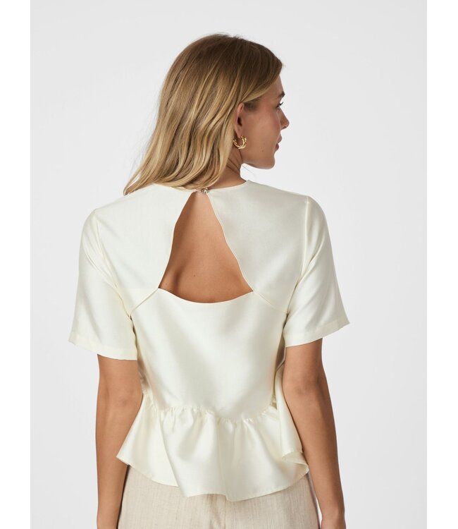 Schattige losvallende blouse met korte mouwen. De blouse heeft een golvende en volumineuze volant. De achterkant is iets open en heeft een schattig knoopje. Het model is 176 cm lang en draagt maat 36. Lees meer.