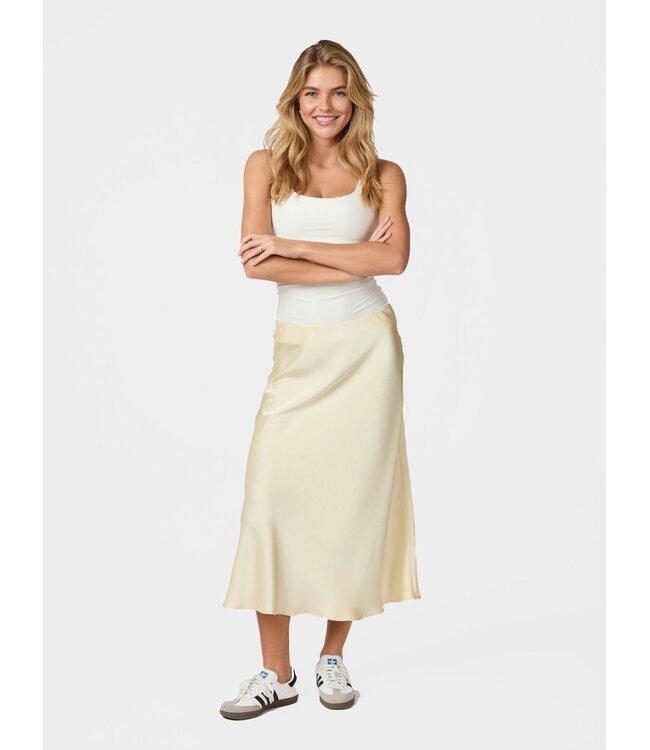 Lange rok met elastiek aan de binnenkant van de taille. De rok is schuin gesneden en heeft een zeer flatterende pasvorm. De kwaliteit is een mooie gladde satijn. Lees meer.