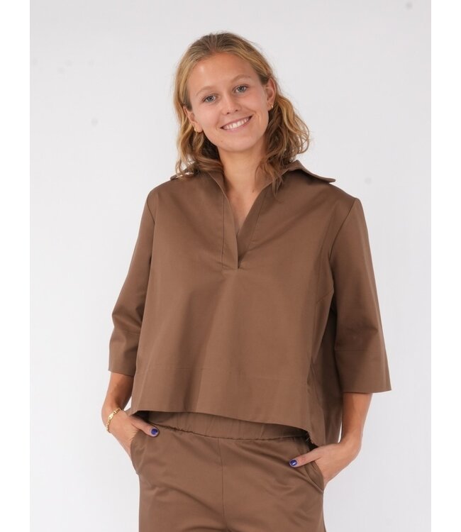 Ruim koert hemd met 3/4 mouw, kraag en V sluiting. Katoen