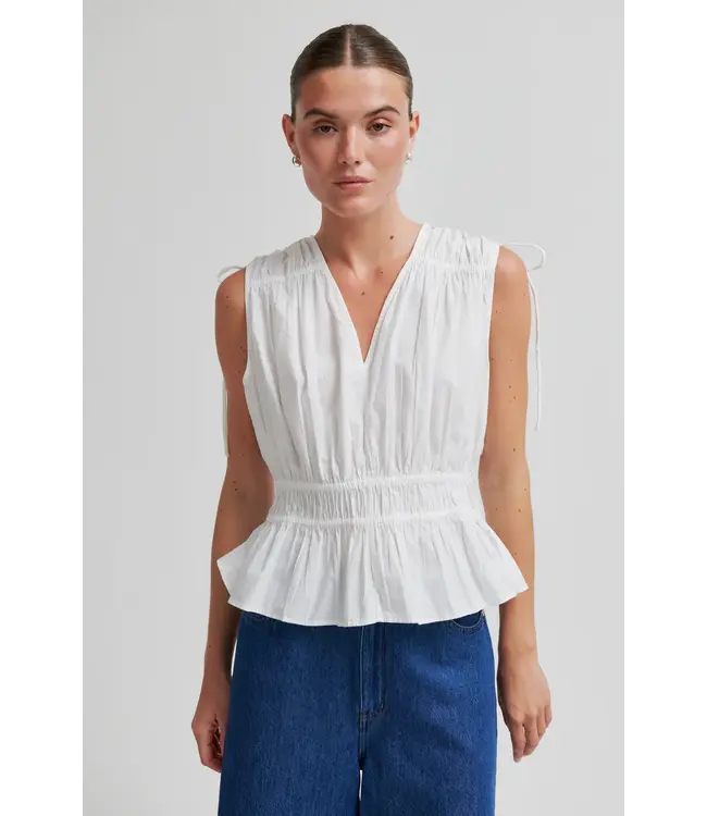 Mouwloze peplumtop van Second Female. De top is gemaakt van licht, soepel katoen. Met een V-hals en een trekkoordje bij de schouders. Elastische naden in de taille die voor een peplumeffect zorgen. Splitten aan de onderkant. Lees meer.