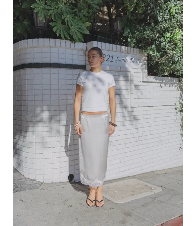 Midi rok met kanten afwerking. Licht glanzende stof. Rechte pasvorm. Achteraan ritssluiting.