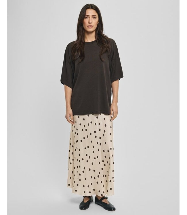 Lange rok met een all-over stippenprint. Lichtgewicht, soepel vallende stof met een glad oppervlak. Elastische tailleband en A-lijn silhouet met een natuurlijke valling.