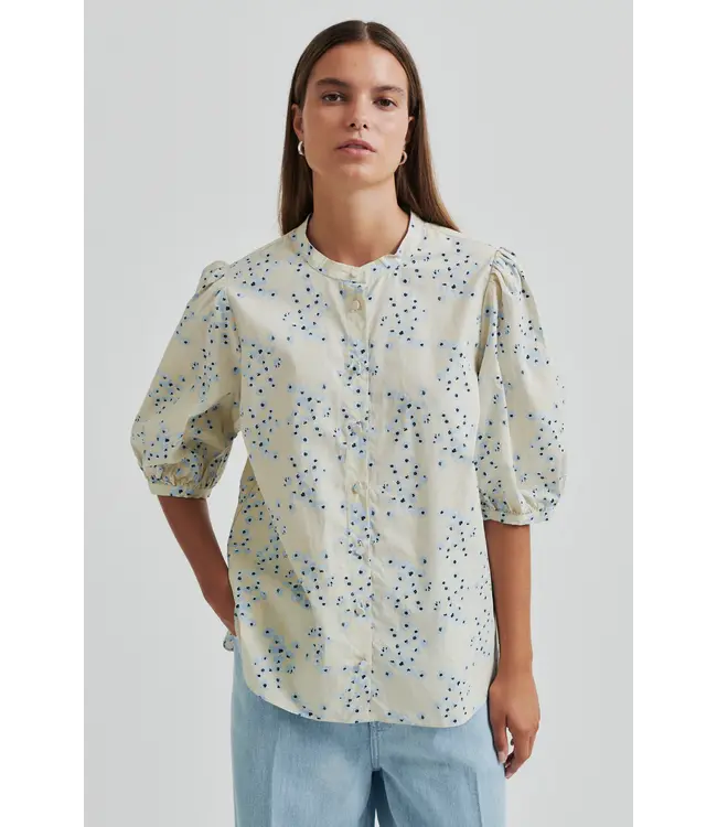 Shirt met bloemenprint, gemaakt van licht en soepel organisch katoen met een all-over bloemenpatroon. Korte pofmouwen met knoop- en lussluiting aan de uiteinden. Gevormde onderkant. Losse ontspannen pasvorm. Lees meer.