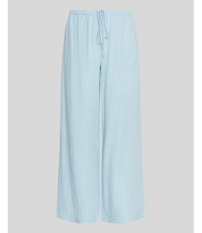 Lange broek van een lichtgewicht geweven stof. Voorzien van een elastische tailleband en een smal trekkoord. Breed silhouet met rechte pijpen en een zachte materiaalstructuur.
