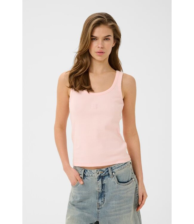 Dit geribbelde hemdje heeft een ronde halslijn en een slank, getailleerd model. De subtiele structuur op de borst geeft de strakke, minimalistische look extra karakter.