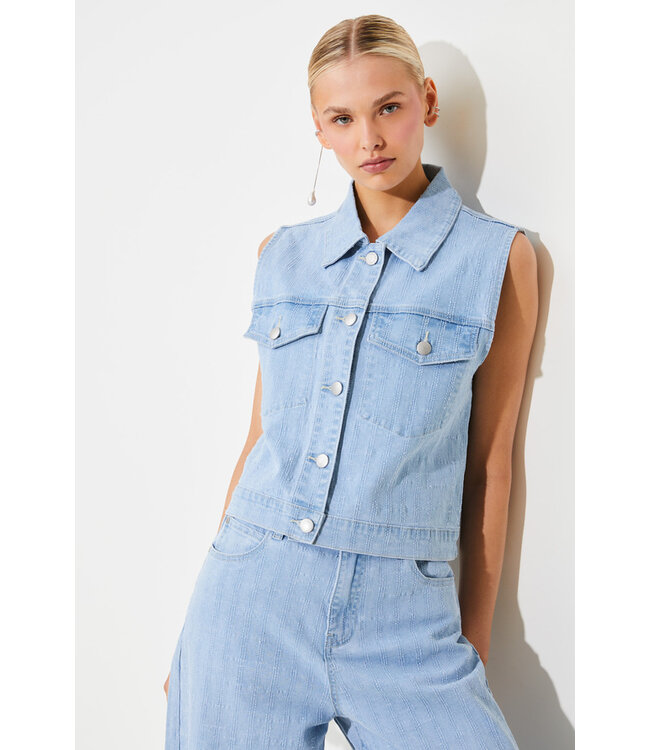 Edele mouwloze spijkerjas, gestreept effect, sluiting met knopen, twee grote opgestikte zakken met klep. Lees meer.