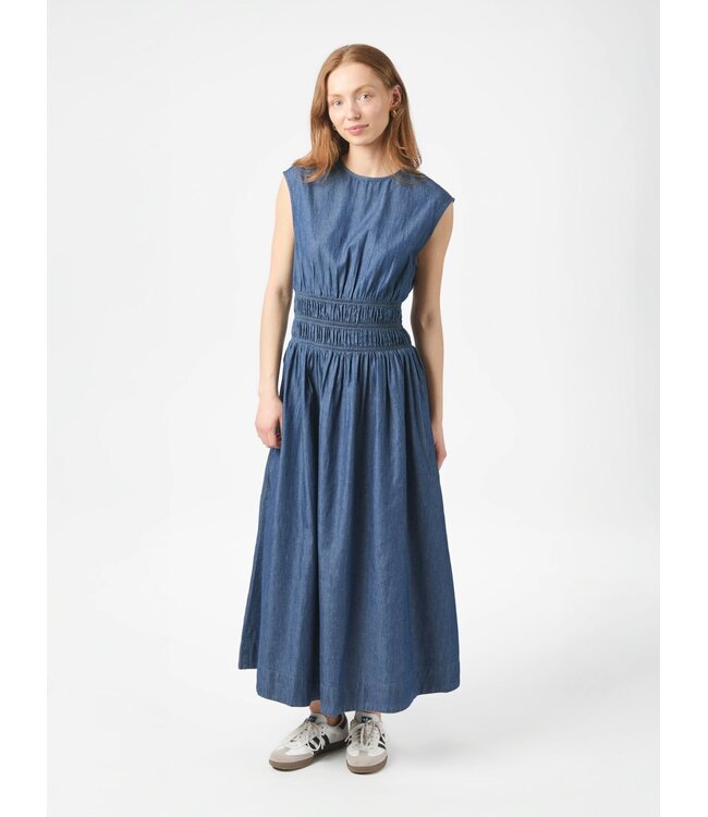 Vrouwelijke spijkerjurk met een getailleerde, gesmokte taille en een wijd uitlopende zoom. De jurk heeft een mooie denimkwaliteit. Lees meer.