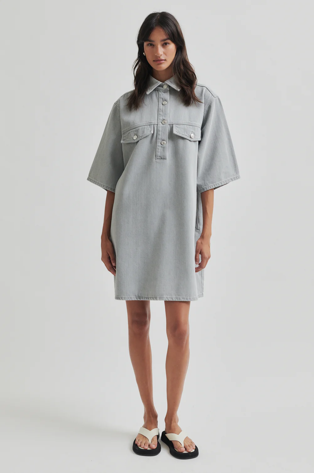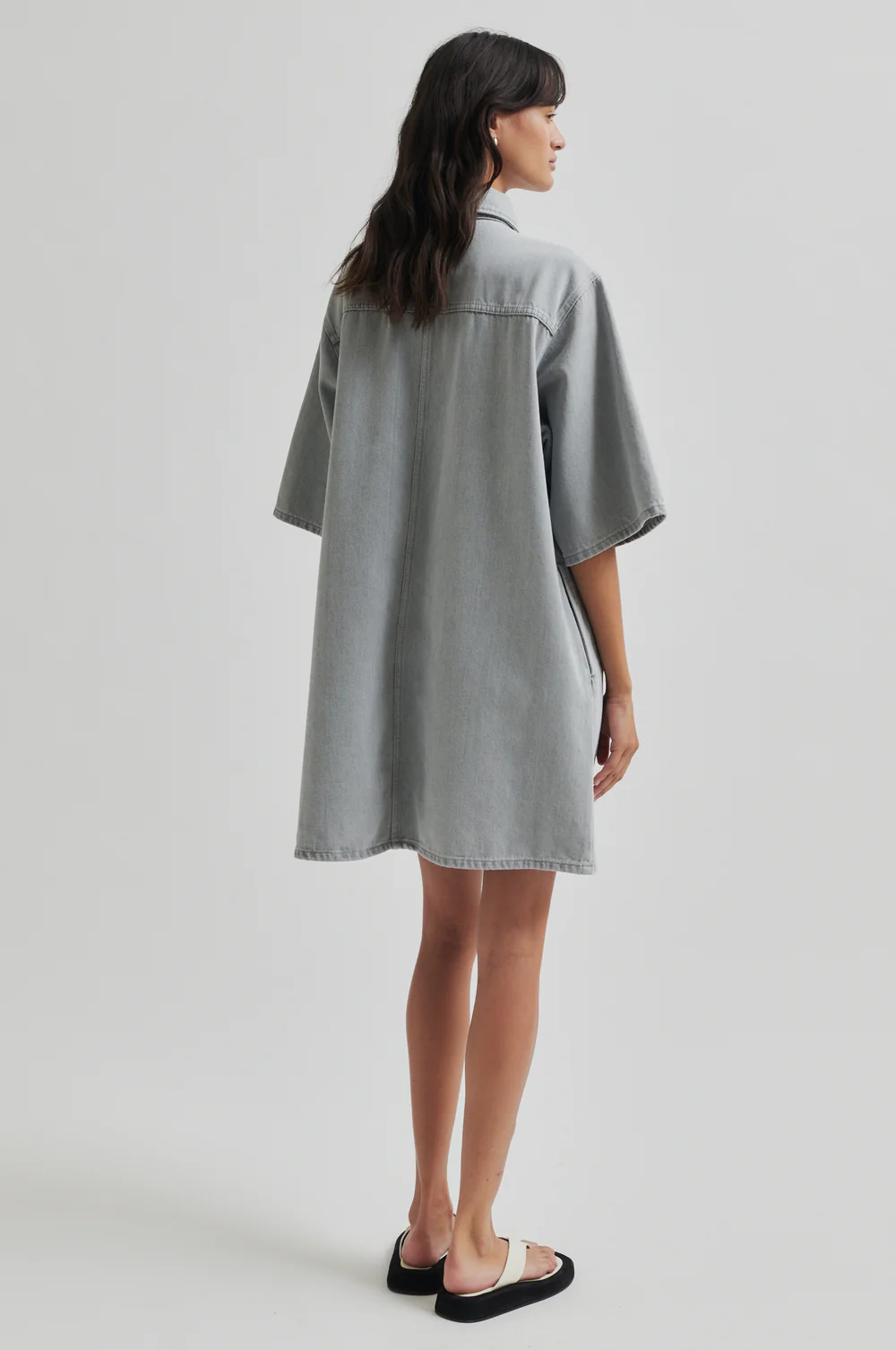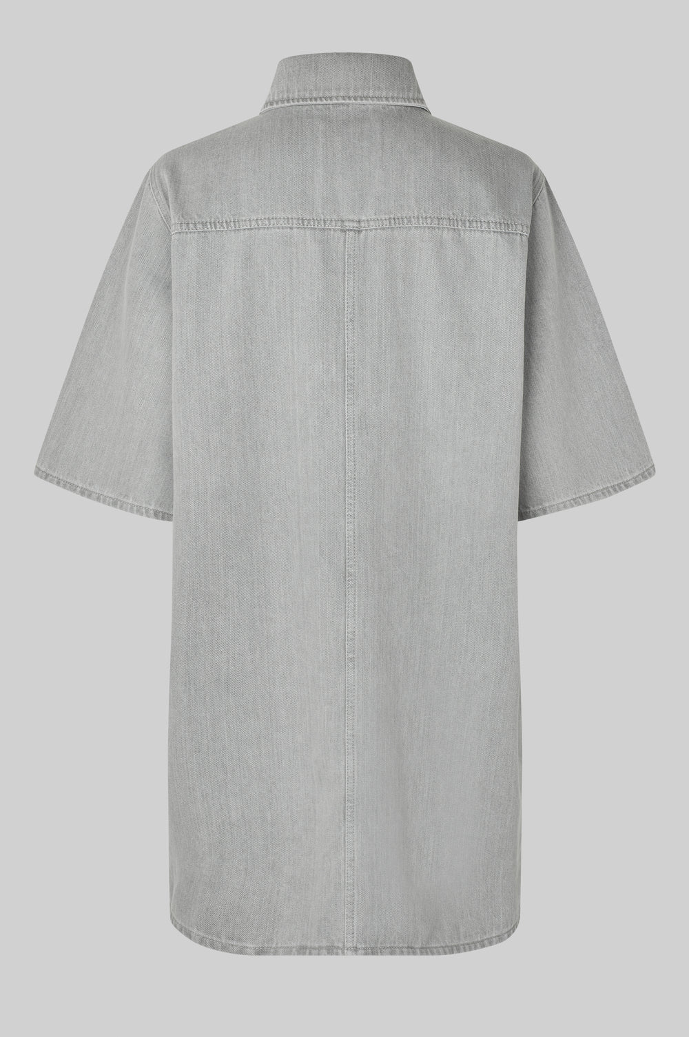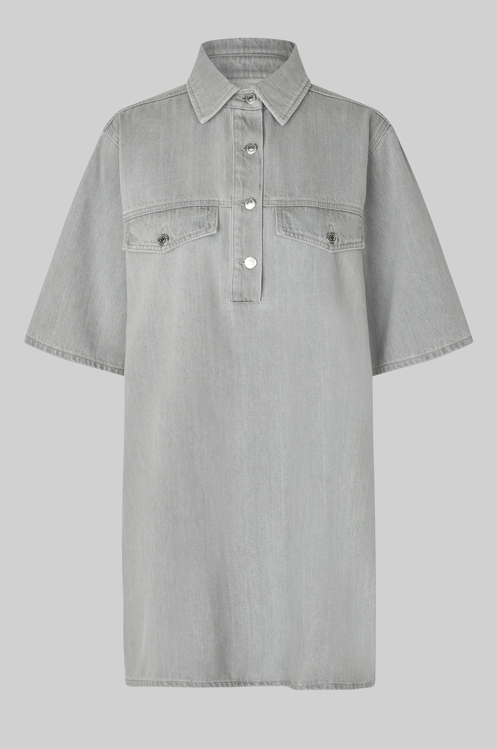 De jurk is gemaakt van katoenen lichtgrijze denim met ton-sur-ton stiksels. De jurk heeft een normale kraag en een halve knoopsluiting. Korte mouwen en decoratieve klepzakken. Verborgen zakken in de zijnaden. Zilverkleurige hardware met merkopdruk.