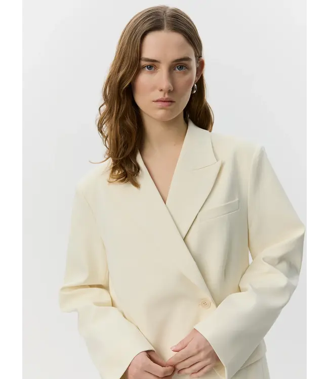 Deze boxy blazer heeft een dubbelgeknoopt ontwerp en een relaxed fit met mouwen tot de pols. Hij is afgewerkt met ton-sur-ton knopen, twee zakken en een decoratief borstzakje.