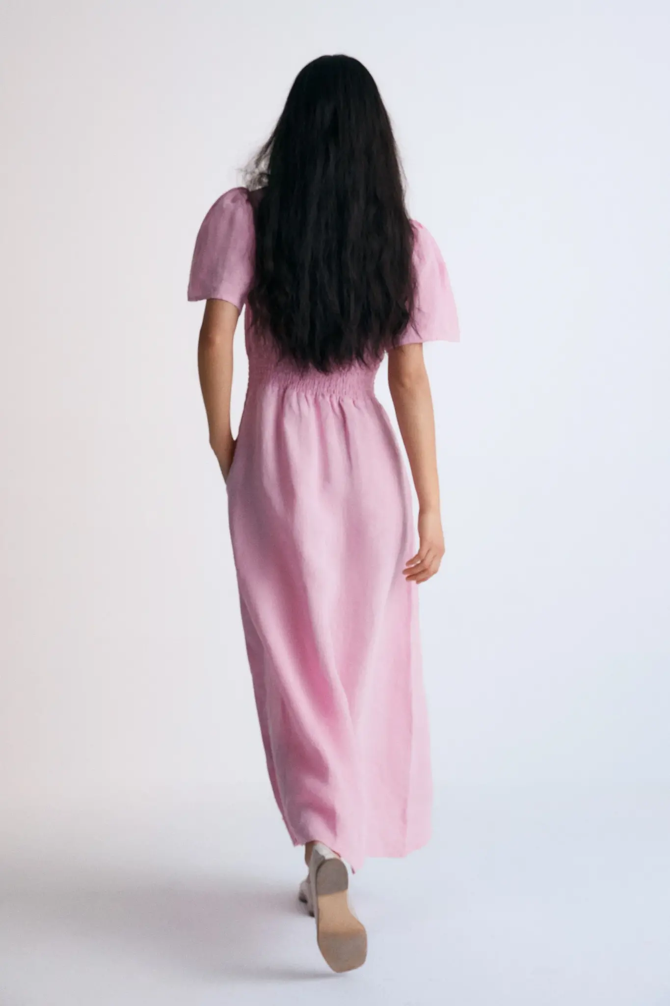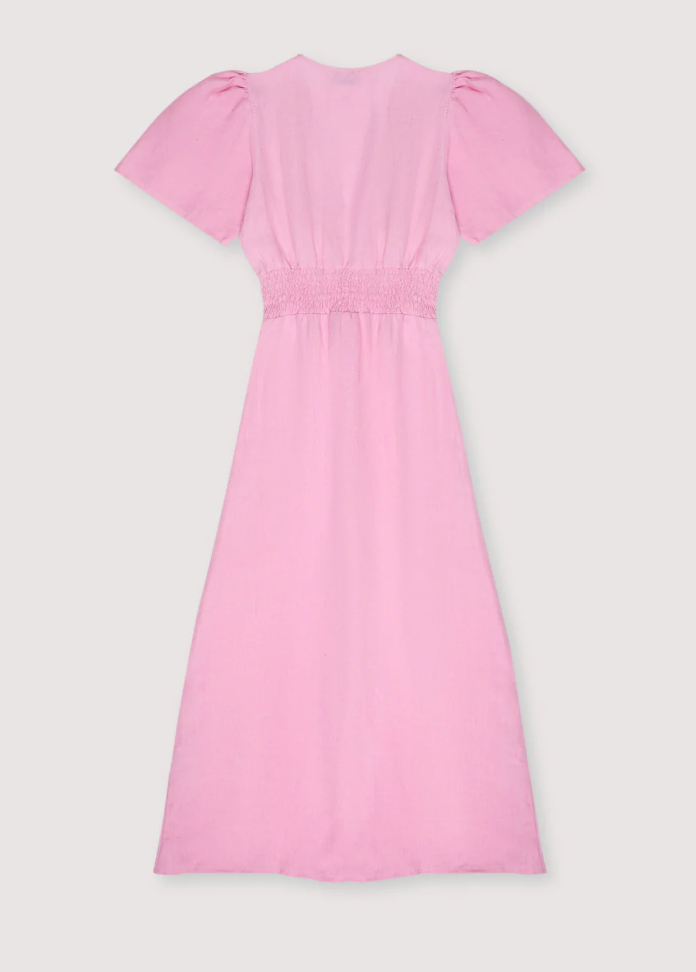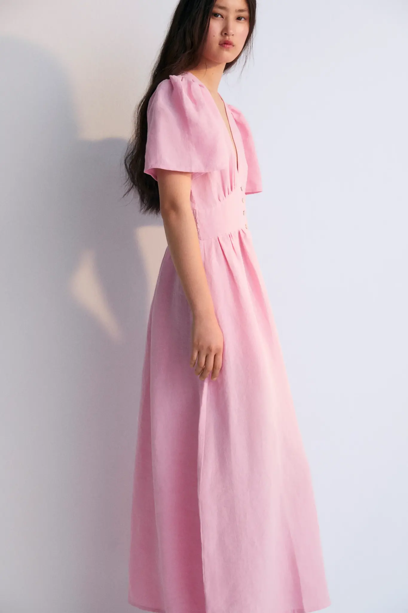 Onze Hera Woman Dress is gemaakt van 100% linnen voor een zachte, ademende pasvorm. Deze flatterende jurk heeft een V-halslijn, korte mouwen met schoudervouwtjes en een rij knopen middenvoor, een combinatie van klassiek design en moderne elegantie.