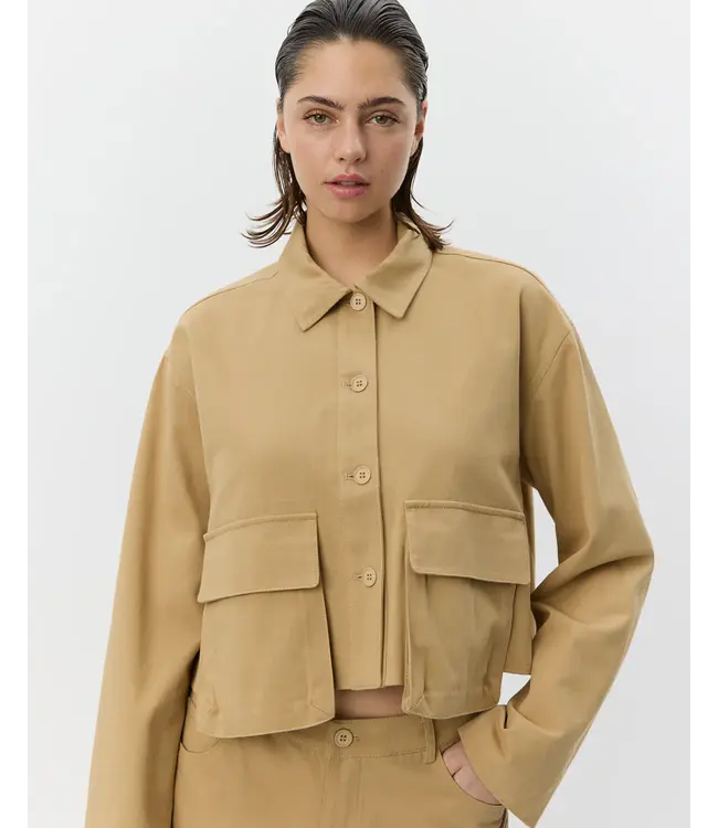 Jasje met regular fit en een klassieke kraag, voorzien van een knoopsluiting aan de voorkant. Het model heeft lange, rechte mouwen en grote borstzakken met klep die iets langer doorlopen dan de lengte van het jasje.