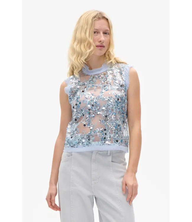 De Manira-blouse is een mouwloze blouse met pailletten, gemaakt van gerecycled polyester met een doorschijnende afwerking. Het model heeft een rechte pasvorm met gerafelde randen. De blouse heeft een ronde hals en een knoopsluiting aan de achterkant.