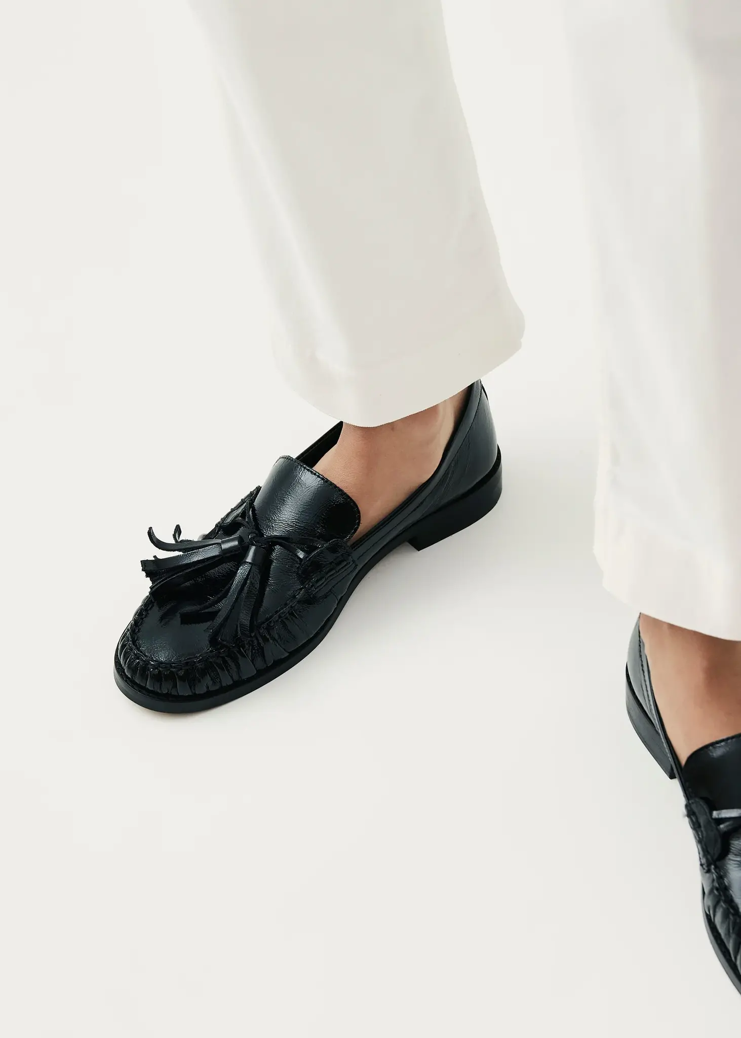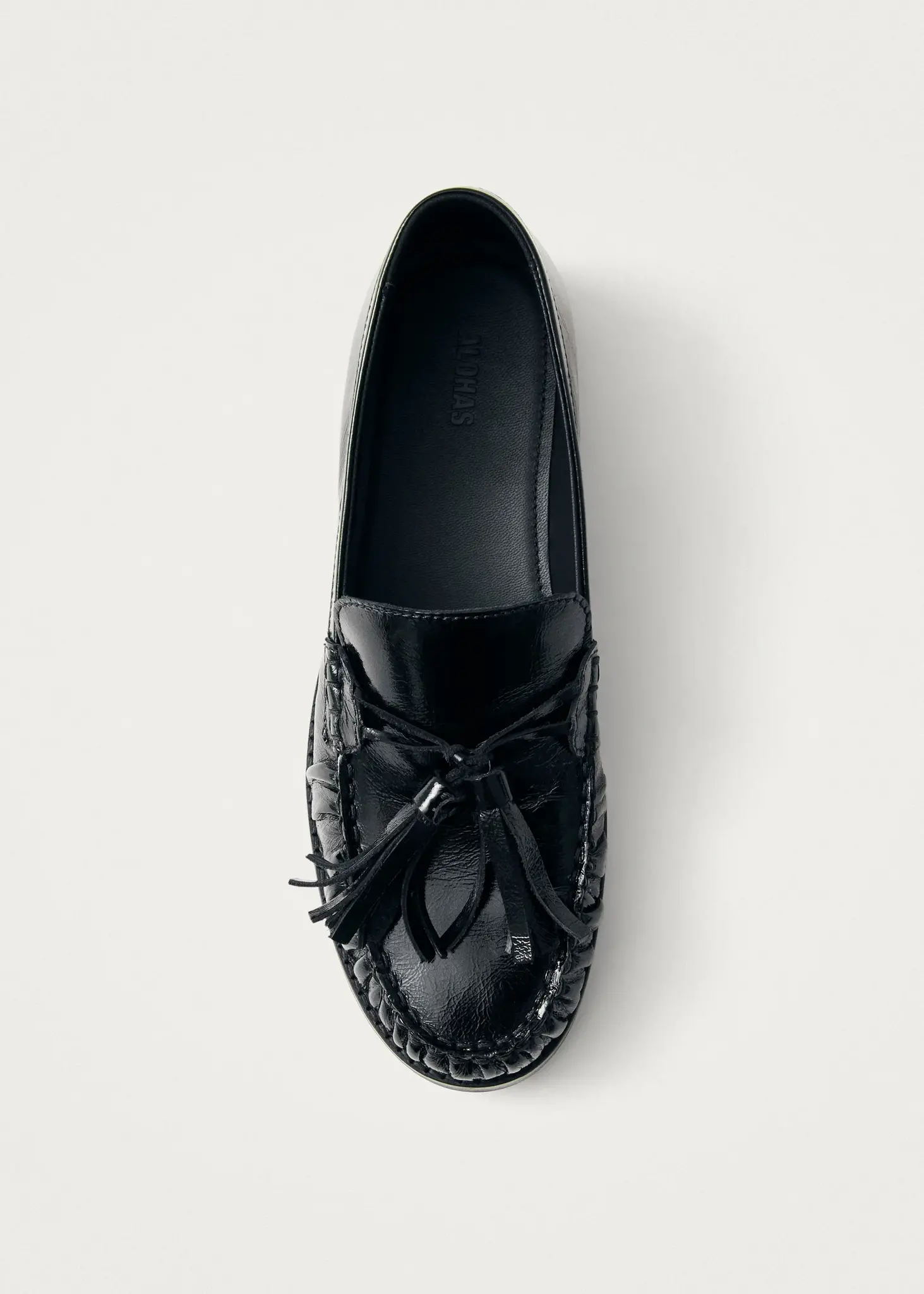 De Marietta loafers zijn gemaakt van zwart lakleer en stralen onmiskenbaar een ouderwetse esthetiek uit. Het bovenwerk wordt gekenmerkt door een gerimpelde leren textuur die diepte toevoegt aan het gepolijste uiterlijk.