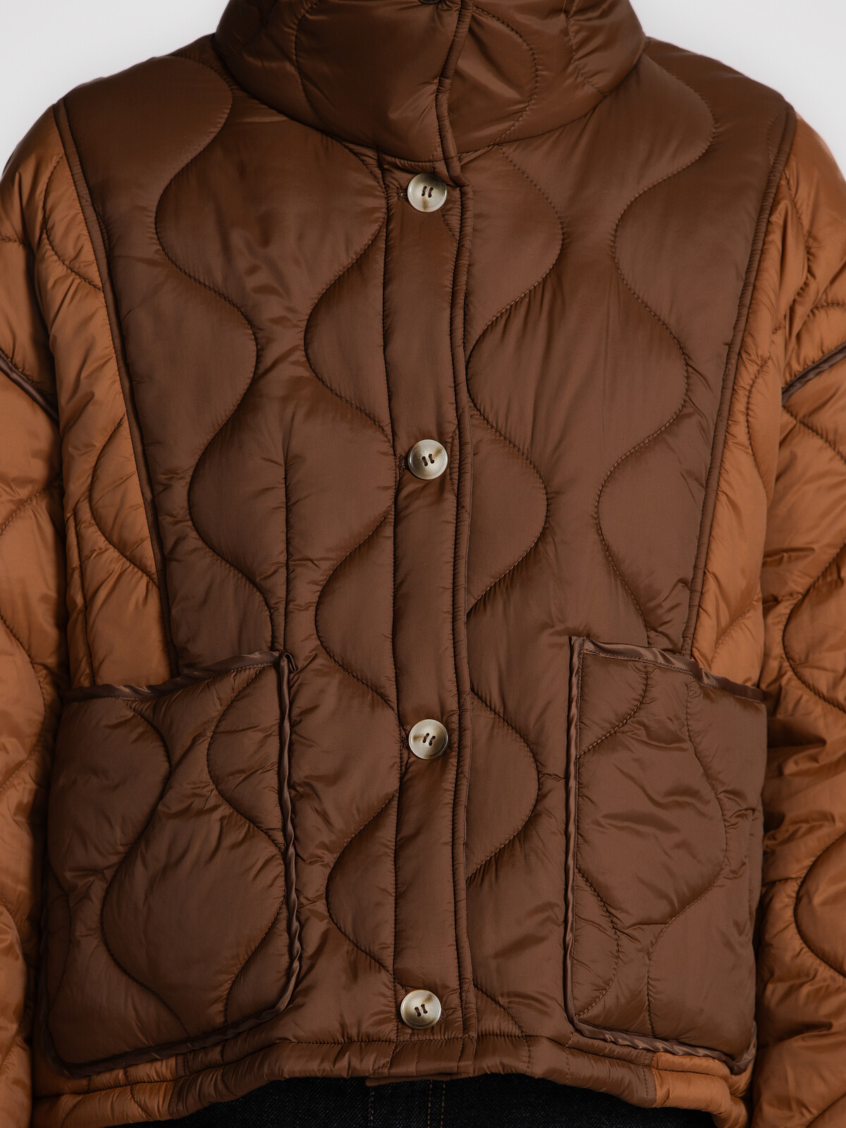 Fall-ready in stijl. Deze gewatteerde jas in bruintinten voelt zacht en warm aan en straalt tegelijk elegantie uit. Perfect voor frisse stadsdagen of een herfstwandeling. Cozy comfort en tijdloze klasse in één stijlvolle jas.