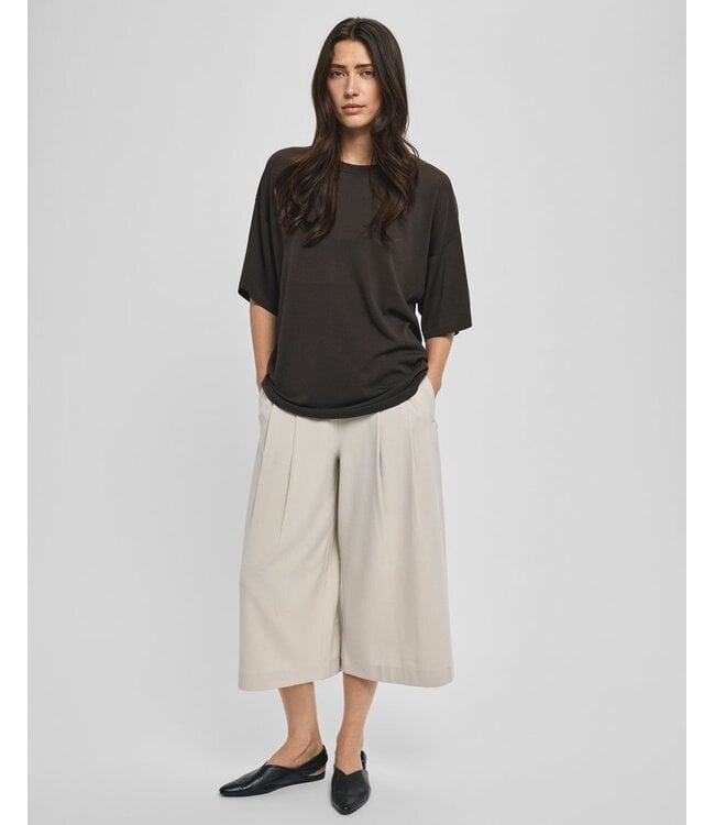 Culottebroek met wijde pijpen en cropped lengte. Ontworpen met een ritssluiting aan de zijkant en riemlussen. Voorzien van plooien aan de voorkant voor structuur.
