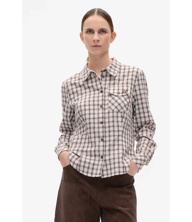 Het Mena-overhemd is een klassiek overhemd van een mix van biologisch katoen. Het heeft een puntkraag, een knoopsluiting aan de voorkant en een klein borstzakje met een geborduurd BP-logo.