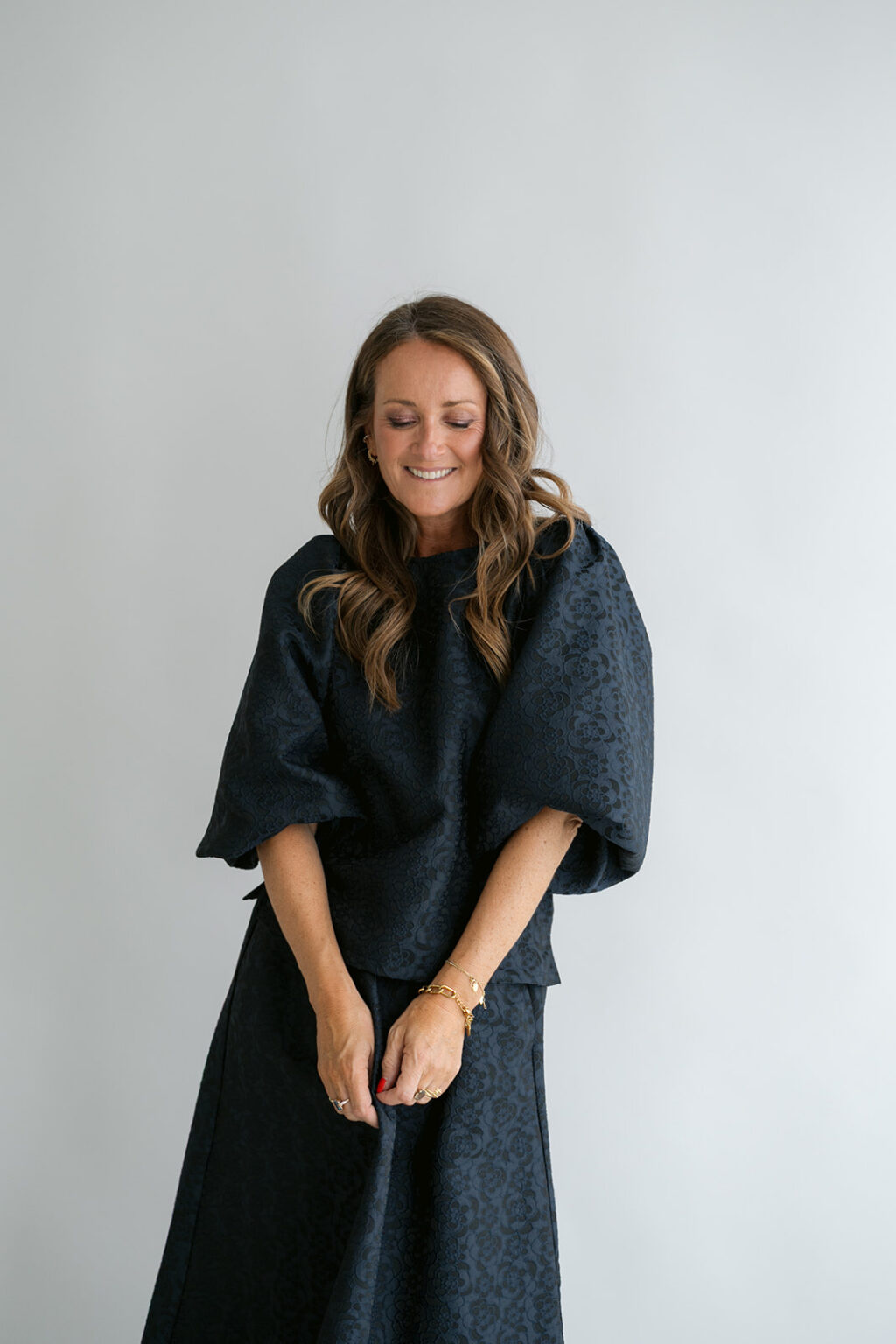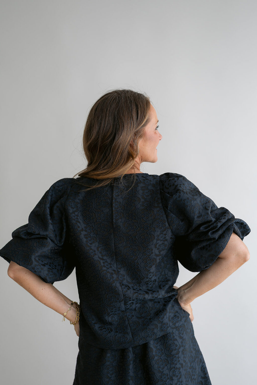 Donkerblauwe blouse met fijne bloemetjesmotief en pofmouwen. Leuk om te combineren op onze Julia Skirt of Sam pants in dezelfde stof voor een full look. Draag deze meer casual op een jeans. Deze blouse tailleert kleiner op de buste.