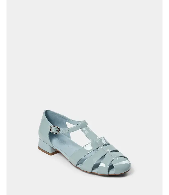 Sandaal met geweven bandjes en verstelbaar enkelbandje met gesp, De sandaal heeft een kleine blokhak en een ronde teen, evenals een glanzend oppervlak Lees meer.