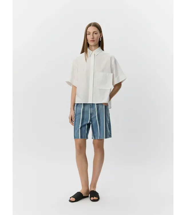 Gestreepte denim shorts met een mid-waist pasvorm en een klassieke five-pocket stijl. Afgewerkt met riemlussen, een rits- en knoopsluiting, denim knopen en een V-vormige tailleband.