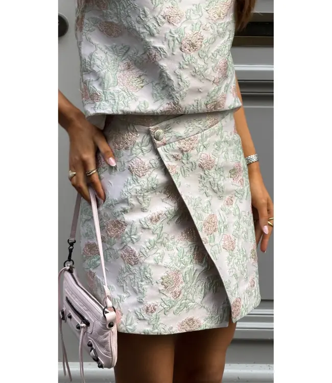 De Pipa Skirt Jacquard in roze, versierd met gouden bloemendetails, is een echt statement piece. Ik combineer hem graag met de bijpassende top voor een chique set, of met een fris wit shirt met lange mouwen voor een meer casual look.