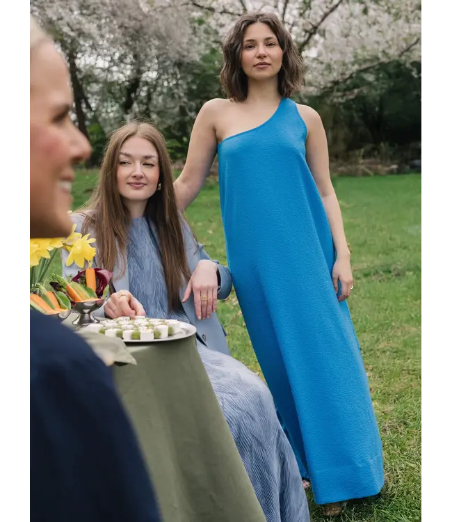 De kleur doet het werk. Diep blauw, helder en aanwezig, zonder te overdrijven. De rest blijft bewust eenvoudig, zodat alles precies klopt. Het soort jurk dat je meteen voor ogen hebt wanneer er iets bijzonders op de planning staat.