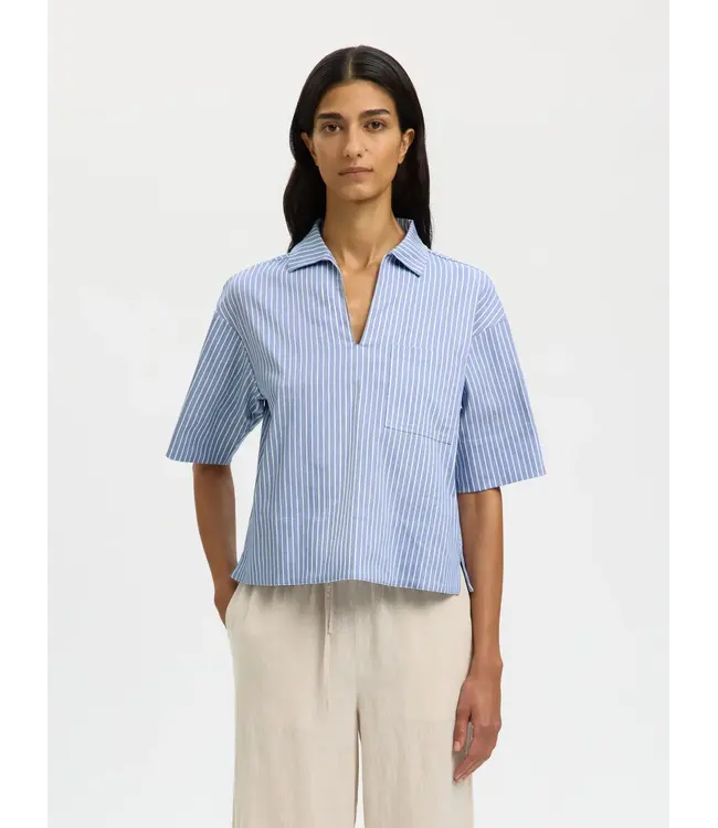 Deze Katoenmix-blouse met V-hals in Dusty Blue van Selected heeft een relaxte boxy fit met verlaagde schouders en halflange mouwen, perfect om casual te combineren met je favoriete denim look.