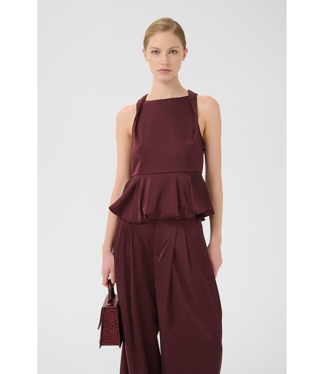 Mouwloze satijnen top met hoge halslijn en gevouwen schouderdetails. Afgewerkt met een gestructureerde peplumzoom die volume toevoegt en zorgt voor een verfijnd, vrouwelijk silhouet. Lees meer.