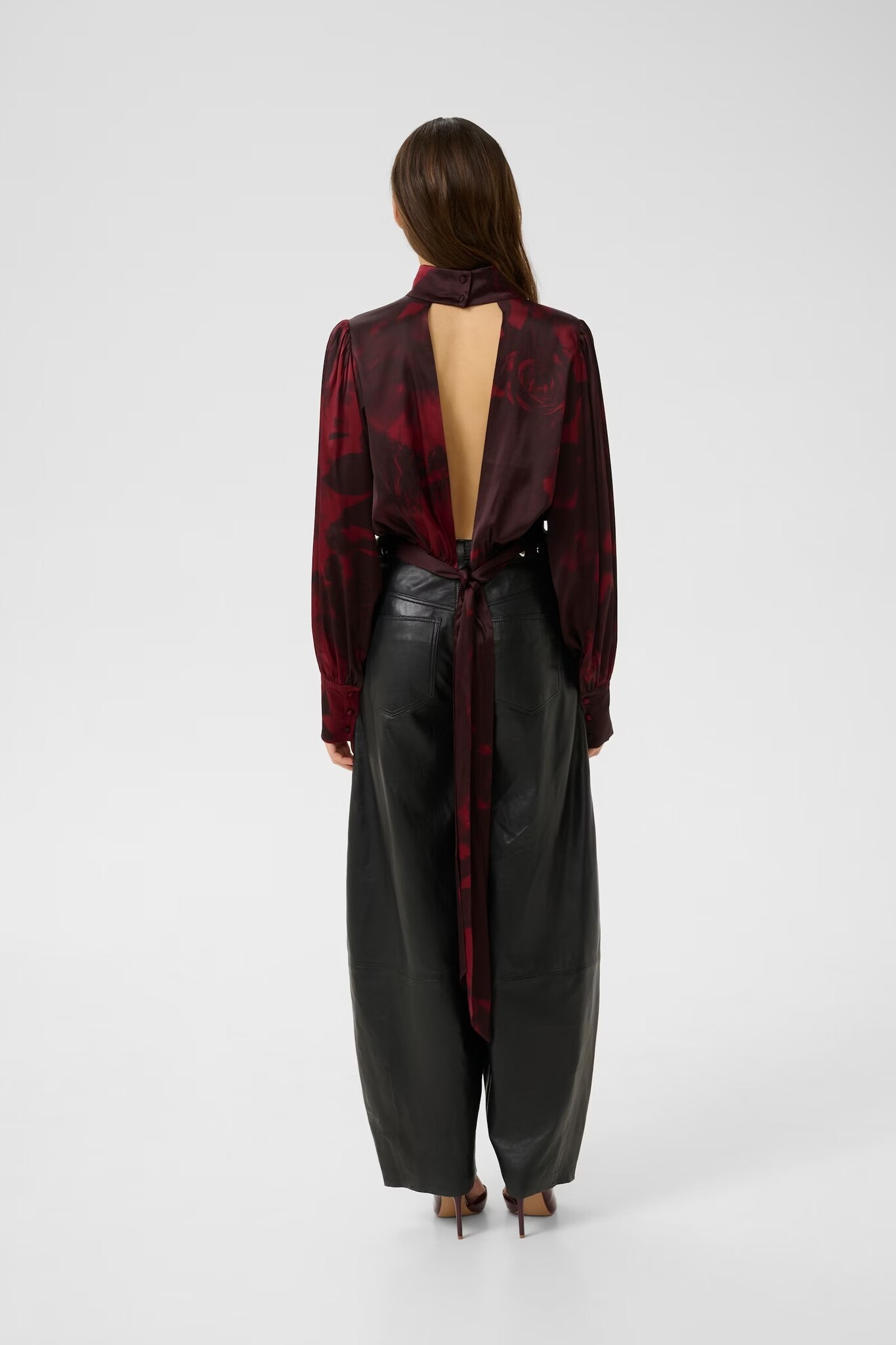 Damesblouse met een elegante hoge halslijn, lange mouwen en een stijlvol detail in de vorm van een strik in de taille. Comfortabele pasvorm met een verfijnd silhouet, perfect voor zowel informele als formele gelegenheden.
