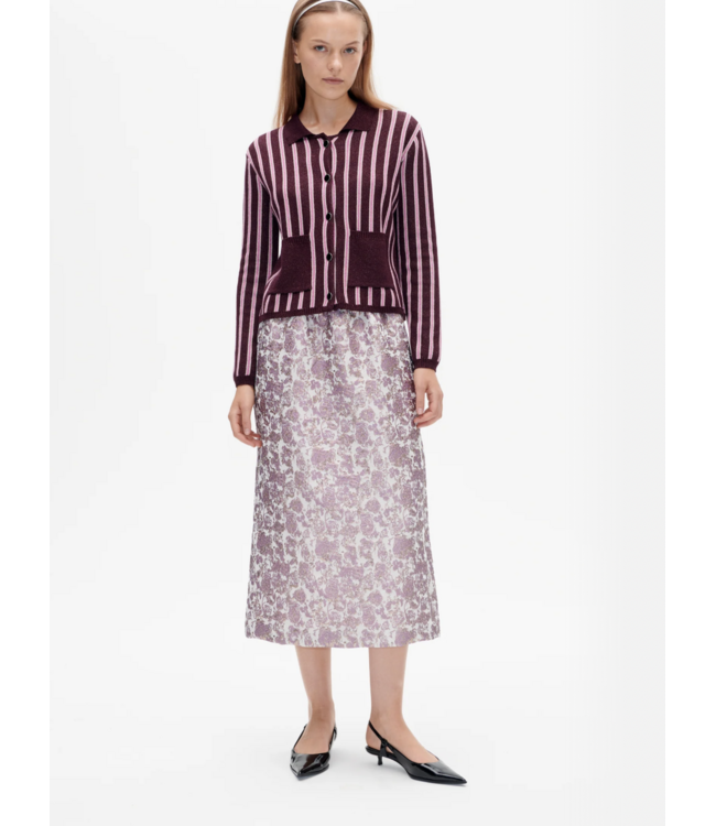 De Sofie rok is een midi-lang ontwerp met een jacquard textuur met metallic draad, die een glans toevoegt aan het silhouet. Het ontwerp heeft een hoge taille voor een flatterende pasvorm en een split aan de achterkant.