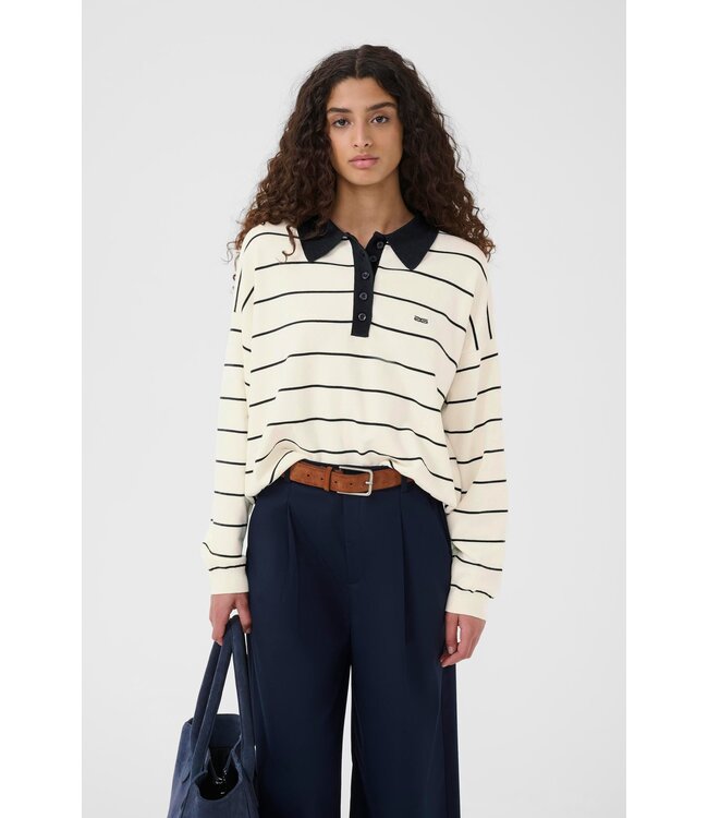 Gestreepte polotrui met rechte pasvorm, klassieke puntkraag en geribde manchetten. Voorzien van een knoopsluiting en geborduurd logo op de borst voor een moeiteloos strakke look.