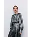 Deze elegante blouse glanst met een zilveren glans en is ontworpen met een ronde halslijn en delicate gerimpelde details voor een sierlijk silhouet. De pofmouwen zijn afgewerkt met brede manchetten en bedekte knopen in bijpassende stof. Lees meer.