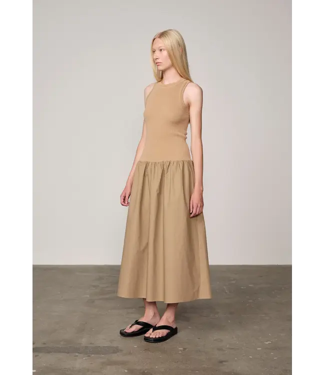 Een hybride jurk die een geribbelde bovenkant combineert met een frisse katoenen poplin rok. Het contrast tussen de zachte, getailleerde tricot en het gestructureerde katoen zorgt voor een verfijnd en toch nonchalant silhouet.